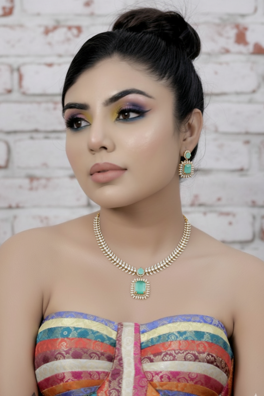Get real gold victorian antique finish vibes with this very ethnic victorian antique gold finish mid length choker; with cubic zirconia stones studded and coloured hydro stone pendant as well as drop earrings necklace. This is lightweight and collarbone set suitable to attend weddings, functions and get to gathers for almost all ages. Great to go with all evening events including sangeet and cocktail.