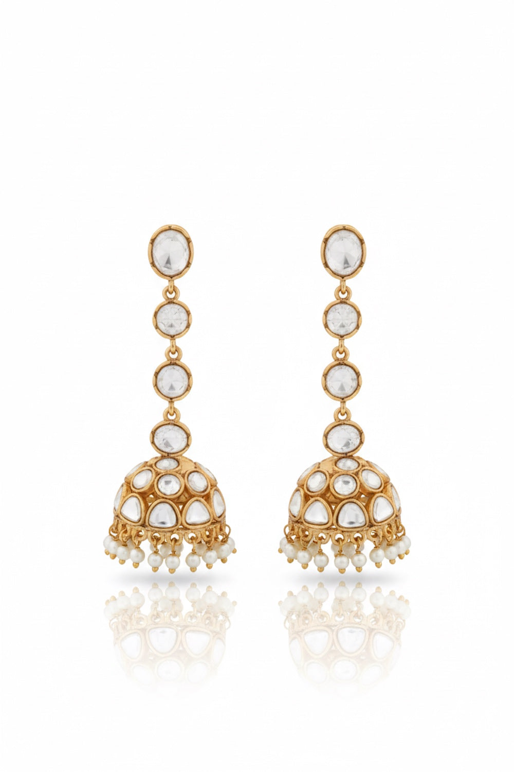 These exquisitely designed gold polished jhumka earrings offer a classic, timeless look. Adorned with polki kundans and with pearl kanser for ane elegant finish, these long studs make for the perfect accessory for any occasion. It adds a touch of elegance to your ensemble.